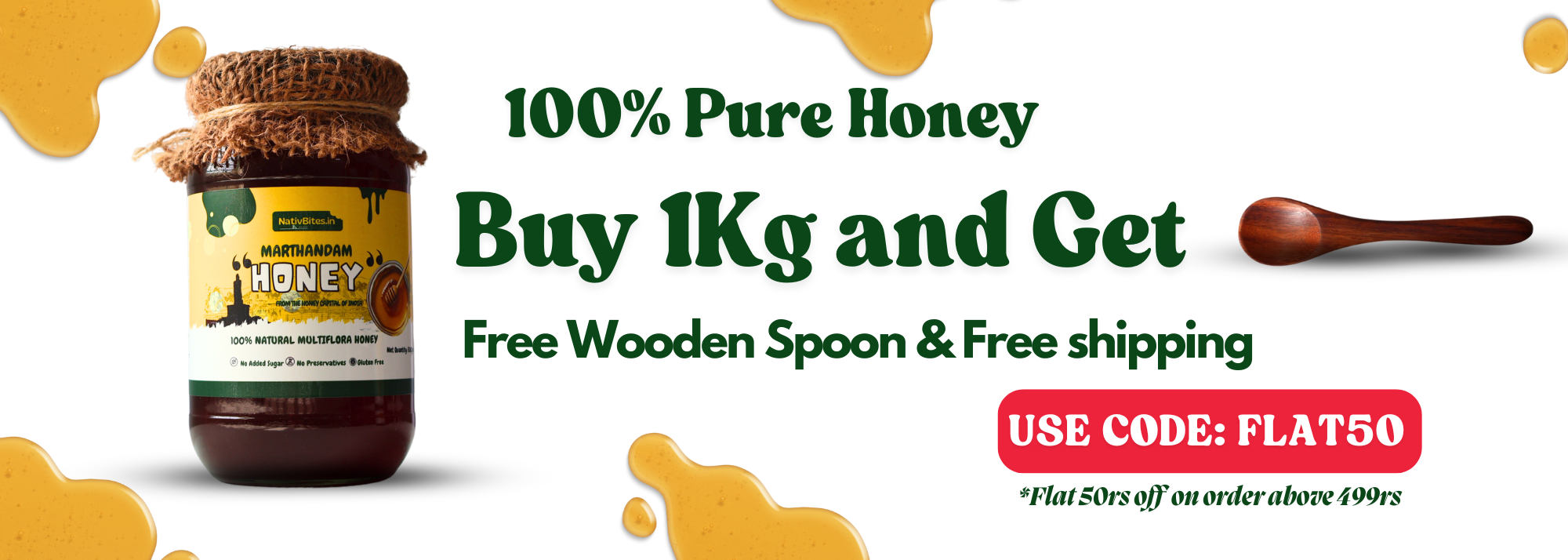 The rich flavor and health benefits of NativBites Marthandam pure Honey, sourced from the pristine landscapes of Tamil Nadu. Our honey is 100% pure and raw honey ensuring that you enjoy only the finest quality